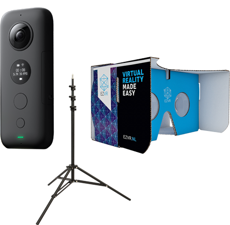 Je ontvangt een VR-camera met statief, een VR-bril van karton en één jaar lang toegang tot EZVR.